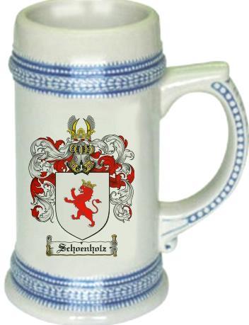 Schoenholz Family Crest Stein / Coat of Arms Beer Tankard. We believe our Coat of Arms Steins are of the highest quality anywhere. The glassware quality is very thick and sturdy. The stein feels great in your hand with a very thick handle. Fill this glass with your favorite beer or beverage. keywords: steins, beer, german, glass, glassware, cup, tankard, goblet, family shields, shield, family, genealogy, heraldry, code of arms