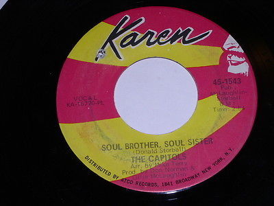 This is a 45 rpm phonograph record by "The Capitols entitled, "Soul Brother Soul Sister". Flipside: "Ain't That Terrible". Record label: Karen 45-1543.