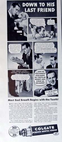 Colgate Ribbon Dental Cream, 30's Print Ad. B&W Illustration (down to his las...