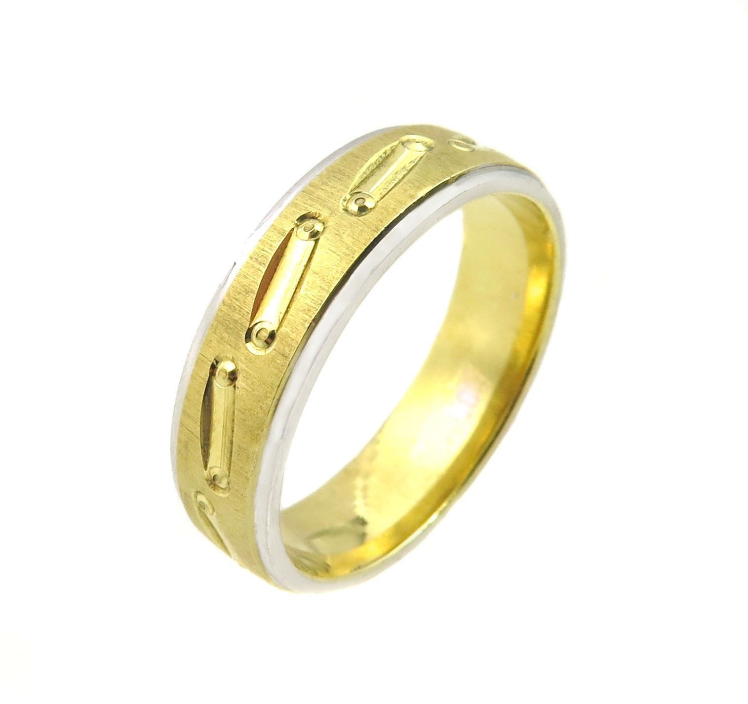 Here we have a beautiful 14k Two Tone Gold Flat Surface and Shiny Cuts with Circles Wedding Band.