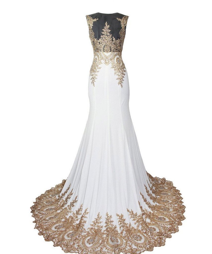 Sexy sheer cap sleeves, Illusion see through front and back top, Long mermaid trumpet skirt, Elegant gold lace appliques, Shiny beaded crystals rhinestones and gems, Bateau neck