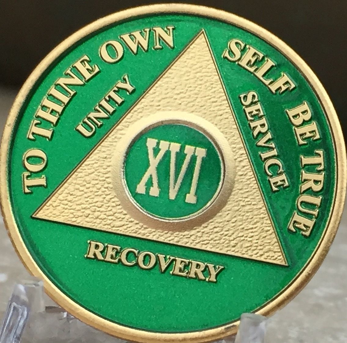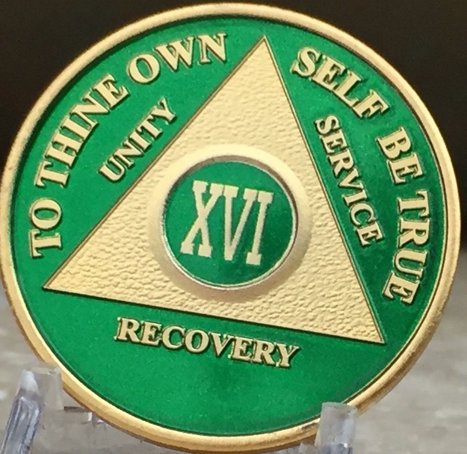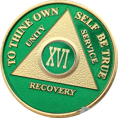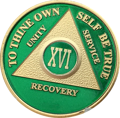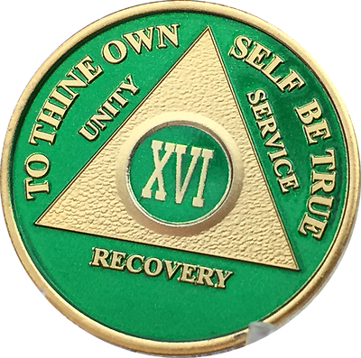 16 Year AA Medallion Green Gold Plated Alcoholics Anonymous Sobriety Chip Coin