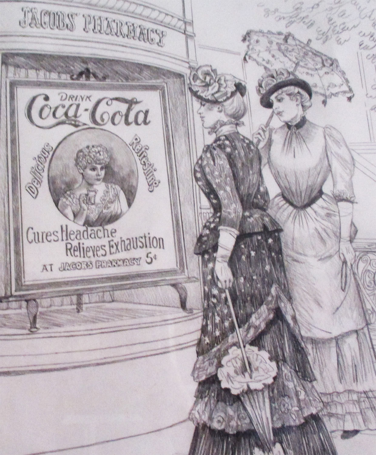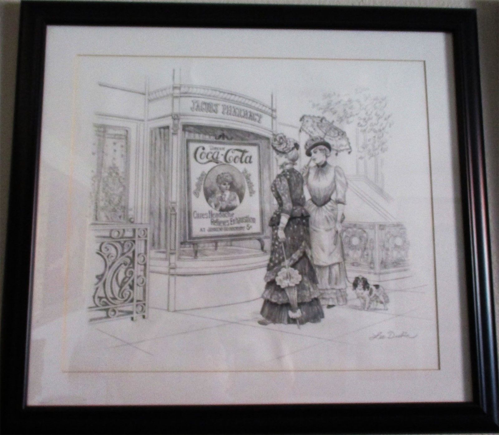 A presentation by Lee Dublin of "Jacob's Pharmacy" the first pharmacy that offered Coca-Cola to the public in the 1890's. Note the victorian style clothing and the use of an elegante woman in the promotion of Coca-Cola. This is an original framed pencil sketch framed measuring 30" wide by 28" tall. An incredible investment of original art by Lee Dubin.