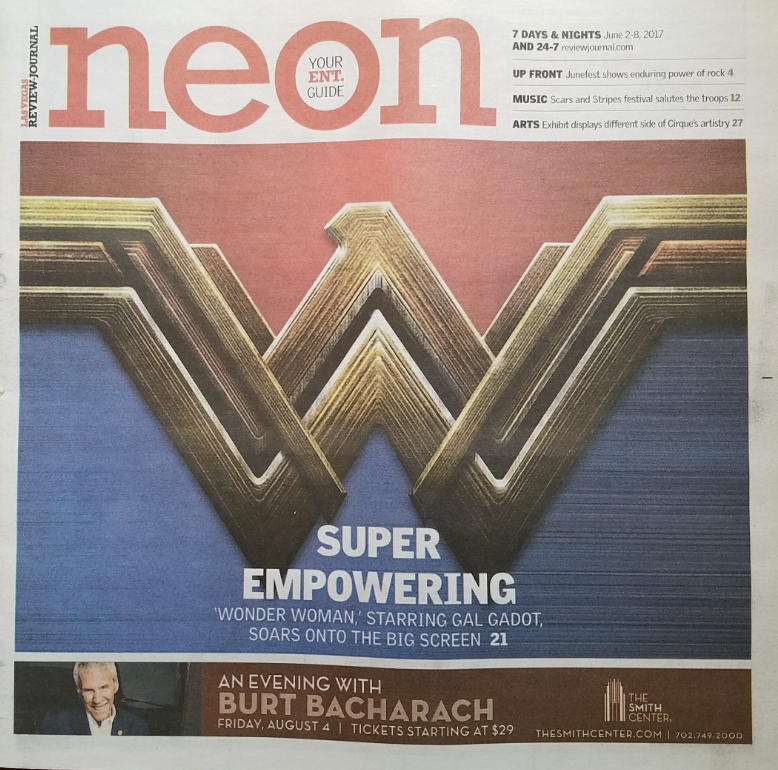 This June 2-8,2017 issue of Las Vegas Review Journal's NEON Magazine, Your Complete Guide To Las Vegas Entertainment, features on cover Gat Gadot stars as Super Empowering 'Wonder Woman'.