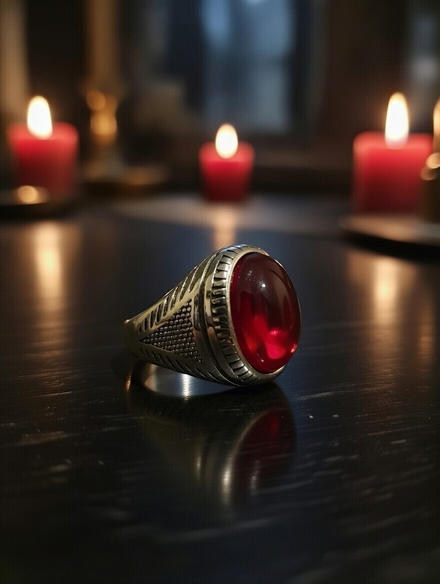 Vessel Details: Ornate design (silver/gold-tone, assuming from niche style), striking stone or accents symbolising blood/red energy + infinite power. Bold unisex fit. Photos show real close-ups with a dark, ethereal glow.
