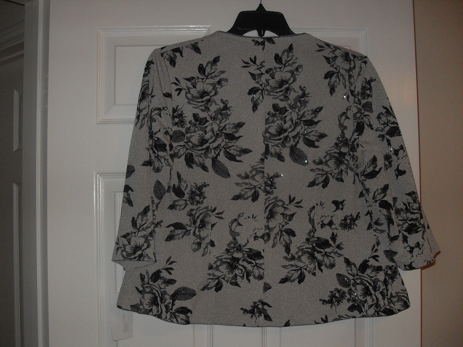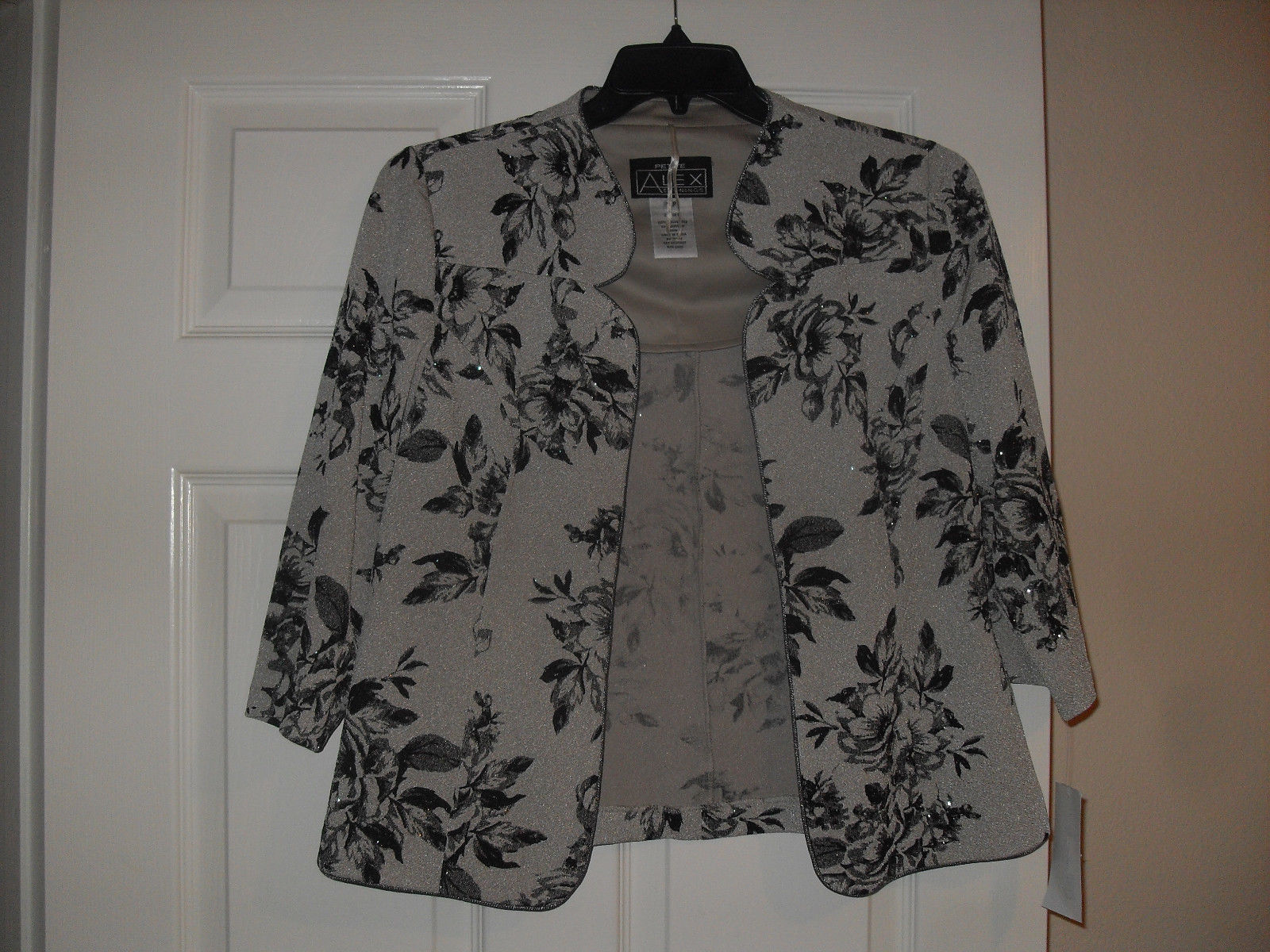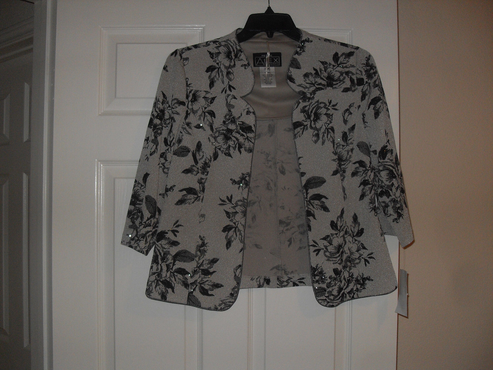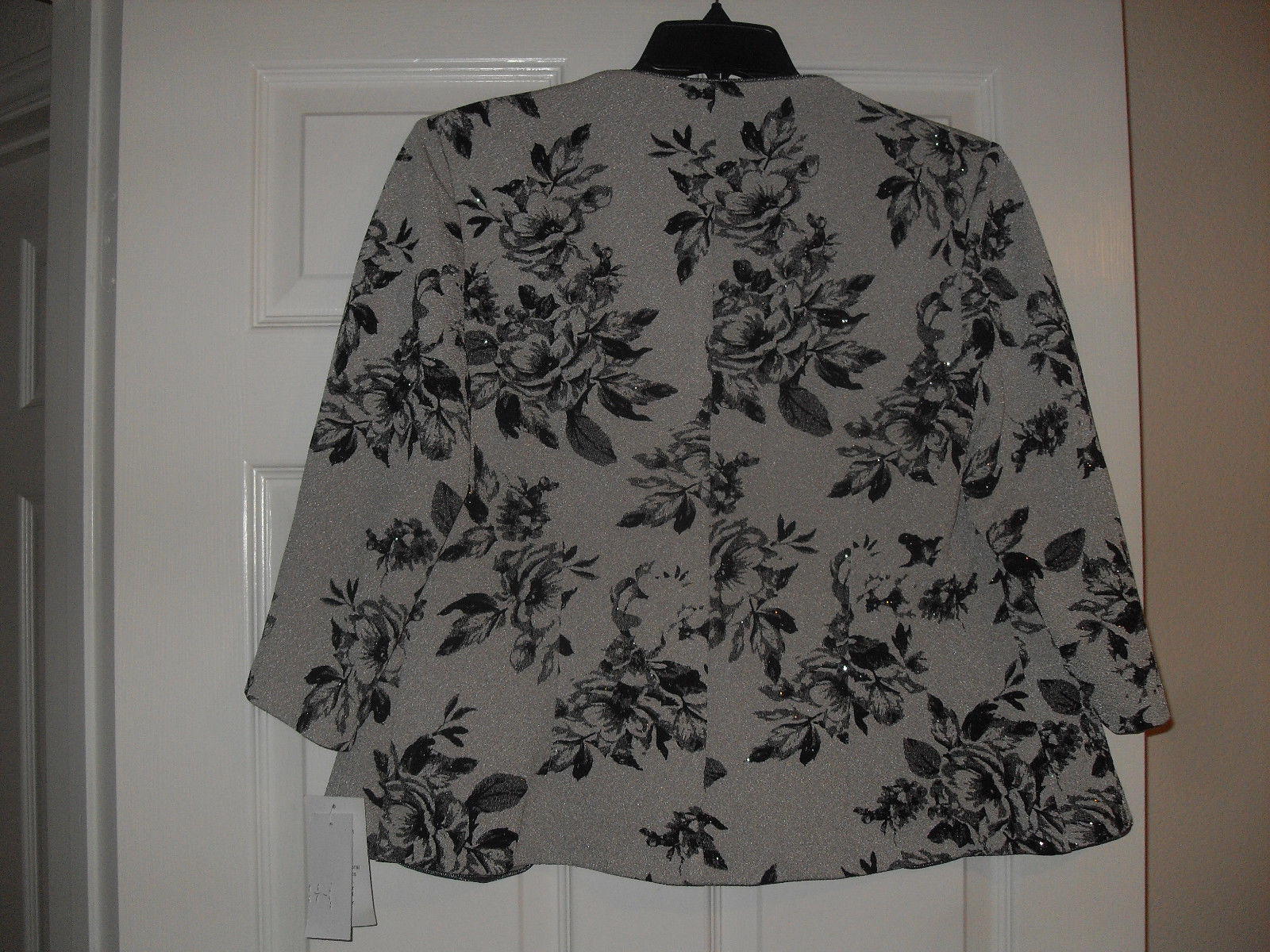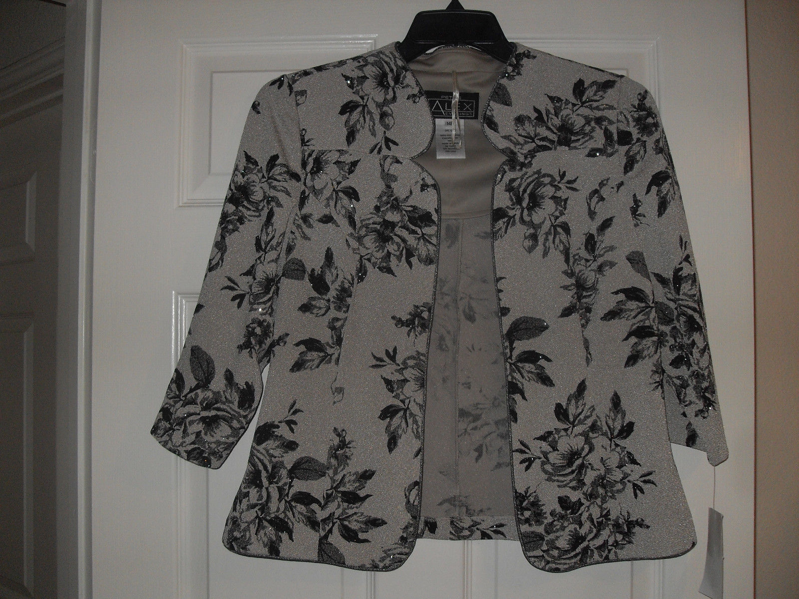 Alex Evenings Womens Black/Taupe Floral Print Open Front Mock Jacket Petites 14P