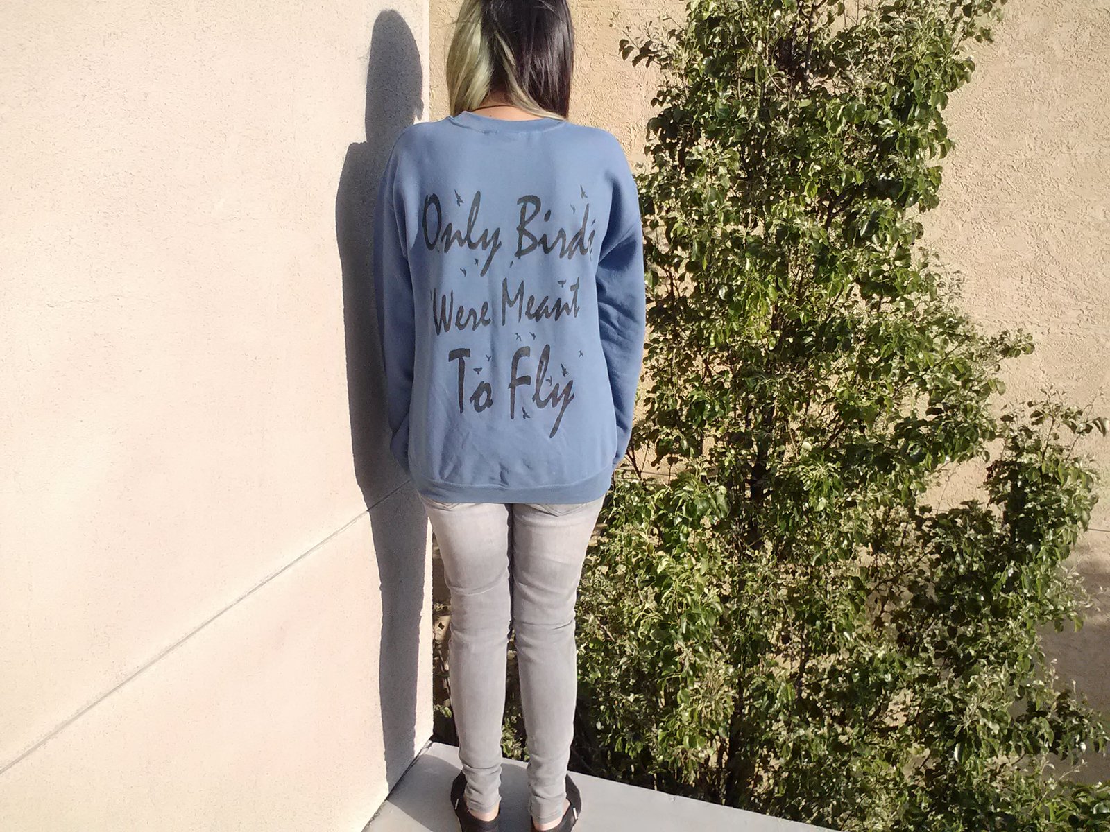The back has the lyrics, "Only Birds Were Meant To Fly" from the song, Antartica.