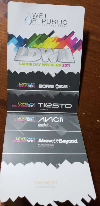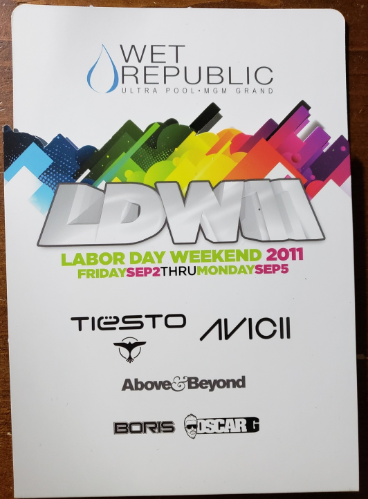Promo card is for Wet Republic Utra Pool MGM Grand Las Vegas, NV for their LDW11 (Labor Day Weekend 2011) and the list of DJs hosting each day: