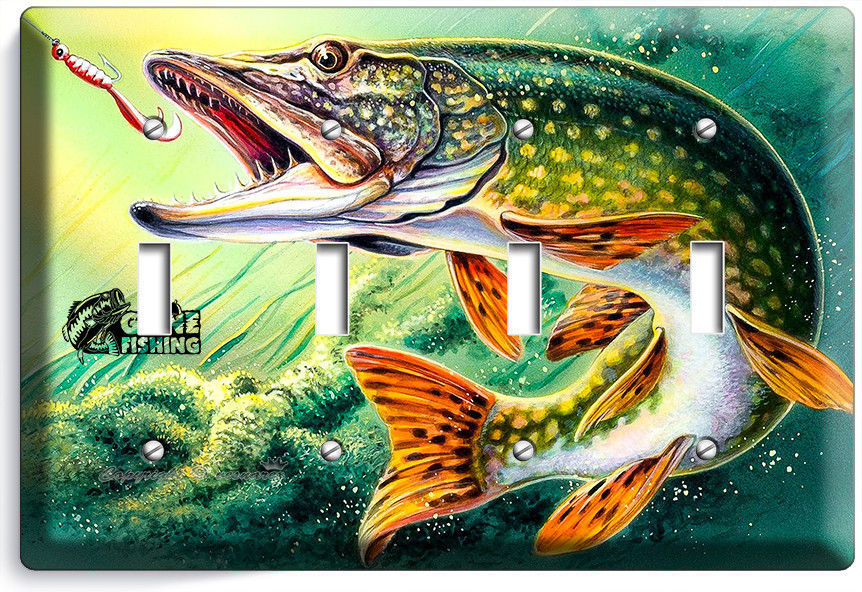 GONE FISHING PIKE LURE LAKE 4 GANG LIGHT SWITCH WALL PLATE ROOM HOME CABIN DECOR