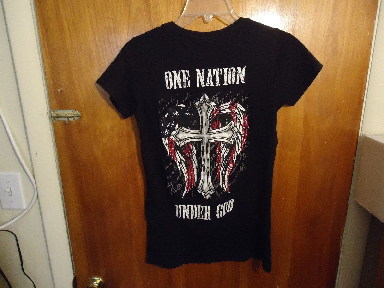 Here is a Womens / Girls District M Black Multi " ONE NATION UNDER GOD " Short Sleeve Top " BEAUTIFUL TOP ".If you have any concerns or questions about this item(s) please ask before bidding / purchasing this item(s).Thank You.-(CL13)