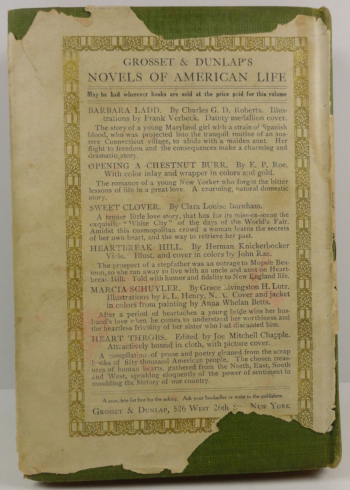 The binding is in acceptable condition, the pages are tanning and some are foxed, the front end paper has been removed. The green cover has a small amount of edge wear and the spine lettering is just about rubbed away. The jacket has stains and is edge worn, about 3 inches of the spine is missing and some edge pieces on the back. Acceptable in poor dust-jacket. Hardcover.