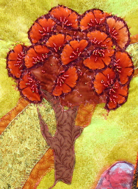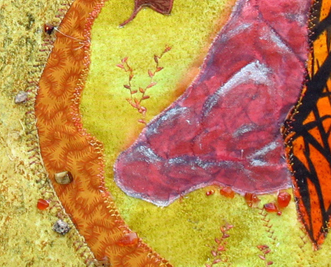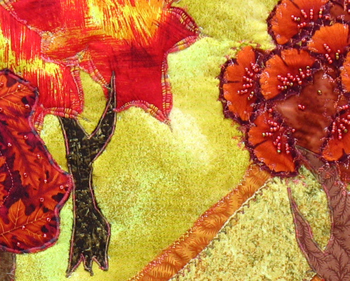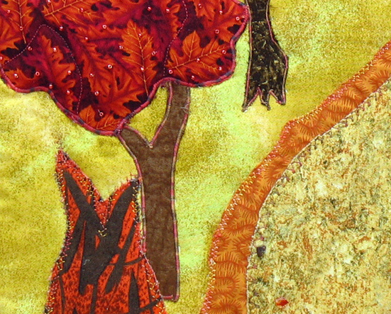 Autumn Path began with the three trees in warm red, orange and yellow tones, and they called out for a yellow background, a path leading through them, and a rock in the space to the right. That rock was originally in a rather contrasting light blue-grey shade, and that color did not seem at all right. Fabric paint saved the day to change it to a red highlighted with silver to fit in better, with some weeds in black and orange to finish it off.