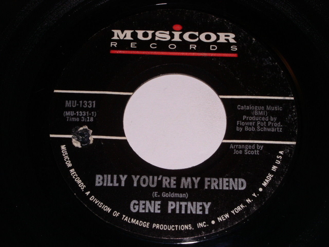 This is a vintage 45 rpm phonograph record by Gene Pitney, entitled, "Billy You're My Friend". Flipside: "Lonely Drifter". Record label: Musicor MU-1331.
