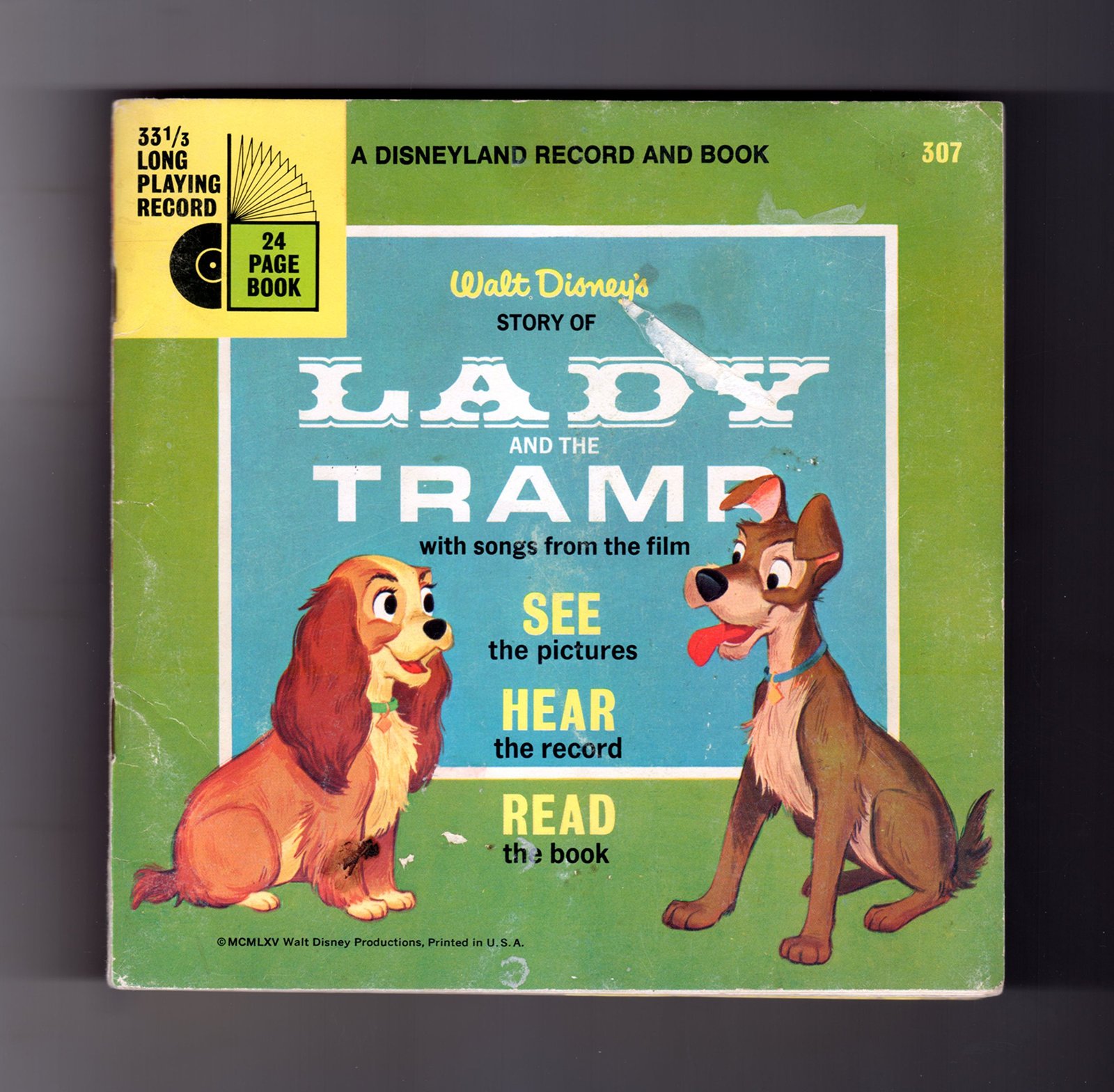 Product description: Very Good. See scans and description. Burbank, CA: Disney Productions / Western Publishing Co. / Disneyland Vista Records, 1965 (copyright 1953; see scans). An early example, with the two-sided 33 1/3 RPM record, of 'Walt Disney's Story of Lady and the Tramp' ("See the Pictures, Hear the Record, Read the Book". 12mo - in this case meaning 7 1/4" x 7 1/4" - illustrated staple-bound wraps, 24 pp. + rear pocket holding the record. Includes original clear plastic sleeve. Very Good; covers have seen some soiling, and rear cover has two notable abrasion (see scans); contents complete and Near Fine. Record, though it appears to have been played, looks Near Fine itself and presumably plays quite well (we have no turntable for testing). One of several early "Lady and the Tramp" Disney offerings. Side A of the record features Robie Lester reading the classic tale, and side B includes songs from the story, including The Siamese Cat Song. Ships in a new, study, protective box. L4