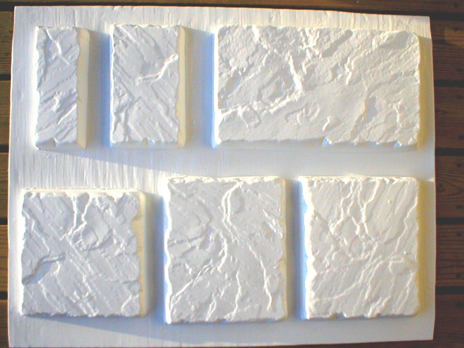 YOU ARE PURCHASING SIX (6), (4.31 SQ. FT.), "OLDE CASTLE STONE" CONCRETE MOULDS TO MAKE CUSTOM-COLORED, STONE WALL VENEER, WALL CAPS, STEPPING STONES, OR STONE TILE FLOORING. WE TELL YOU HOW! THESE MOULDS ARE "SIZED" TO COVER THE TOP OF A CONCRETE BLOCK WALL THAT HAS BEEN STONED ON BOTH SIDES. THE PHOTO ILLUSTRATION IS OF A 12" CAP, WHICH OVER-LAPS THE WALL. THESE 10" CAPS BLEND RIGHT INTO THE SIDES TO MAKE A UNIFORM STRAIGHT EDGE WALL.
