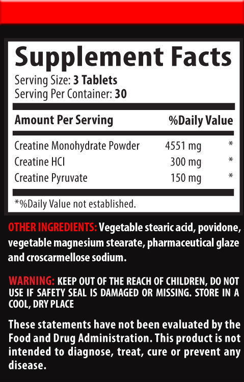 NEW Premuim Blend of Creatine Monohydrate, Creatine Alphaketoglutarate and Creatine Pyruvate. Creatine Alpha-Ketoglutarate: The Future Of Creatine Has Arrived! One of the most innovative and increasingly popular forms of creatine available today is creatine alpha-ketoglutarate (a.k.a., creatine-AKG). Creatine supplementation may increase muscle mass, strength, and power. Serving Size - 3 Tablets. Total Servings - 30. Tablets per Bottle - 90.