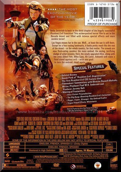 Plot: Captured by the Umbrella Corp., Alice receives genetic alterations that leave her with superhuman abilities. Hiding out in the Nevada desert, she joins forces with former cohorts Carlos and L.J. as well as new survivors Claire, K-Mart and Nurse Betty to eradicate the virus that threatens to turn every human on Earth into a zombie. 042919-042919P-DVD1