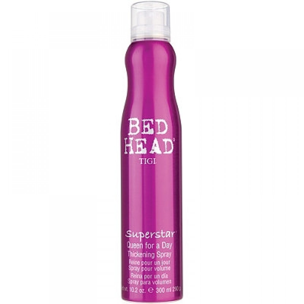TIGI Bed Head Superstar Queen for a Day Thickening Spray is a thickening mousse spray that gives volume, body and lift. It strengthens, conditions and moisturizes hair for a natural, non-sticky feel. TIGI Bed Head Superstar Hair Spray ""Queen for a Day"" is good for fine to medium hair texture, any length.