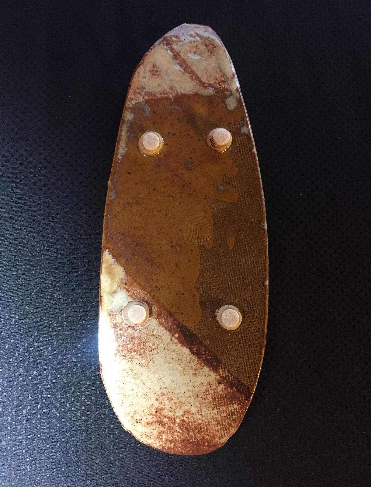 Gorgeous little plate or spoonrest- perfect for a little plant, jewelry, or your utensils while you're cooking. Hand pressed and glazed, with a unique long oval overall shape. Dual gloss glaze, dark and light brown. Has 4 little feet on the underside, with soft pads attached.