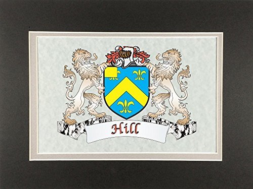 Hill Irish Coat of Arms Print - Frameable 9" x 12" Authentic Irish coat of arms frameable 9" x 12" inch print. Four piece set includes a high-quality print of your Irish family coat of arms on a heavy 65lb cover weight parchment paper, heavy all-black backing board, and TWO separate matboards. Fits any standard 9" x 12" frame. Authentic Irish coat of arms printPrinted from high quality Vector art filesHeavy duty all-black backing boardNo mounting necessaryTwo separate matboards (inside color: clay, outside color: dark olive)9" x 12" frameable sizeShrink wrapped for deliveryChoose from over 1200 available Irish coat of arms.