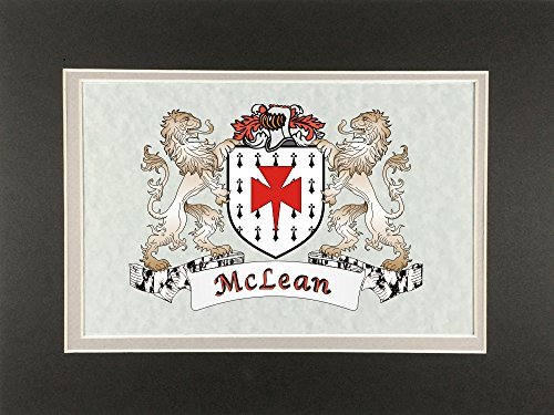 McLean Irish Coat of Arms Print - Frameable 9" x 12" Authentic Irish coat of arms frameable 9" x 12" inch print. Four piece set includes a high-quality print of your Irish family coat of arms on a heavy 65lb cover weight parchment paper, heavy all-black backing board, and TWO separate matboards. Fits any standard 9" x 12" frame. Authentic Irish coat of arms printPrinted from high quality Vector art filesHeavy duty all-black backing boardNo mounting necessaryTwo separate matboards (inside color: clay, outside color: dark olive)9" x 12" frameable sizeShrink wrapped for deliveryChoose from over 1200 available Irish coat of arms.