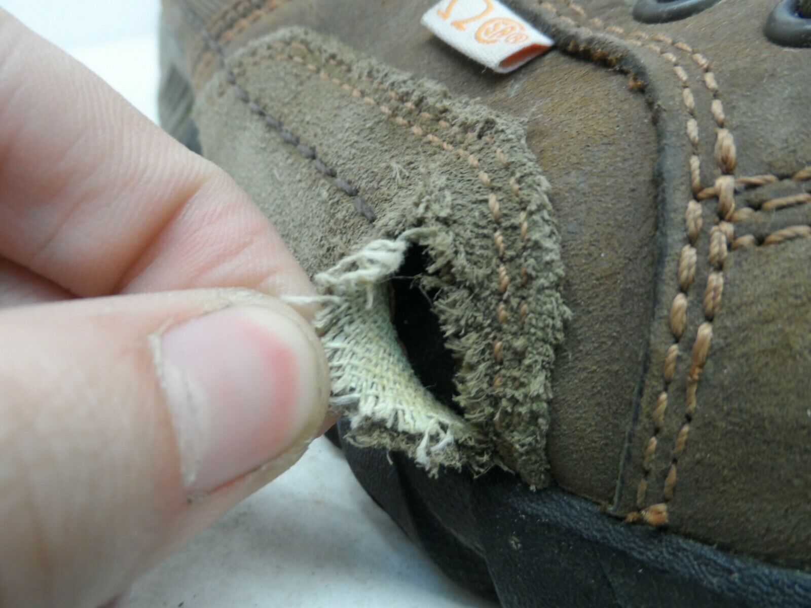 TEAR IN UPPER MATERIAL ON RIGHT SHOE