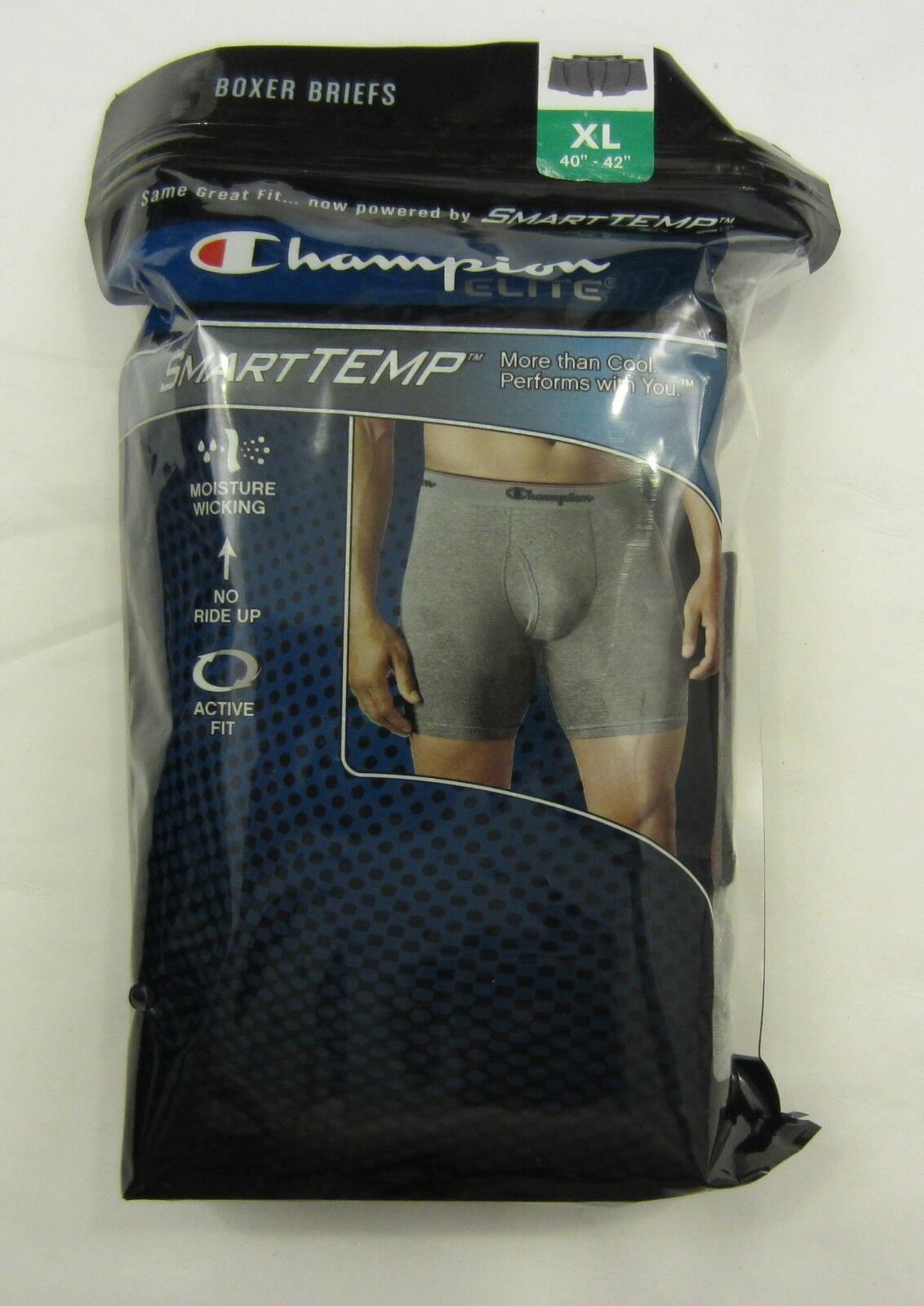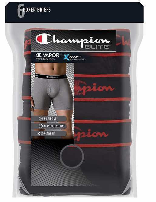 New 3-Pack or 6-pack of Champion Elite SmartTemp Men's Boxer Briefs ?SMARTTEMP . More than Cool. Performs with you. Choice of a pack of 3, pack of 5 or pack of 6 boxer briefs. Available colors: 3 pack: 3 Black, 3 Gray, or 3 Blue 5 pack: 2 Light Gray, 2 Dark Gray, 1 Blue 6 pack: 6 Black, 3 Gray/3 Blue