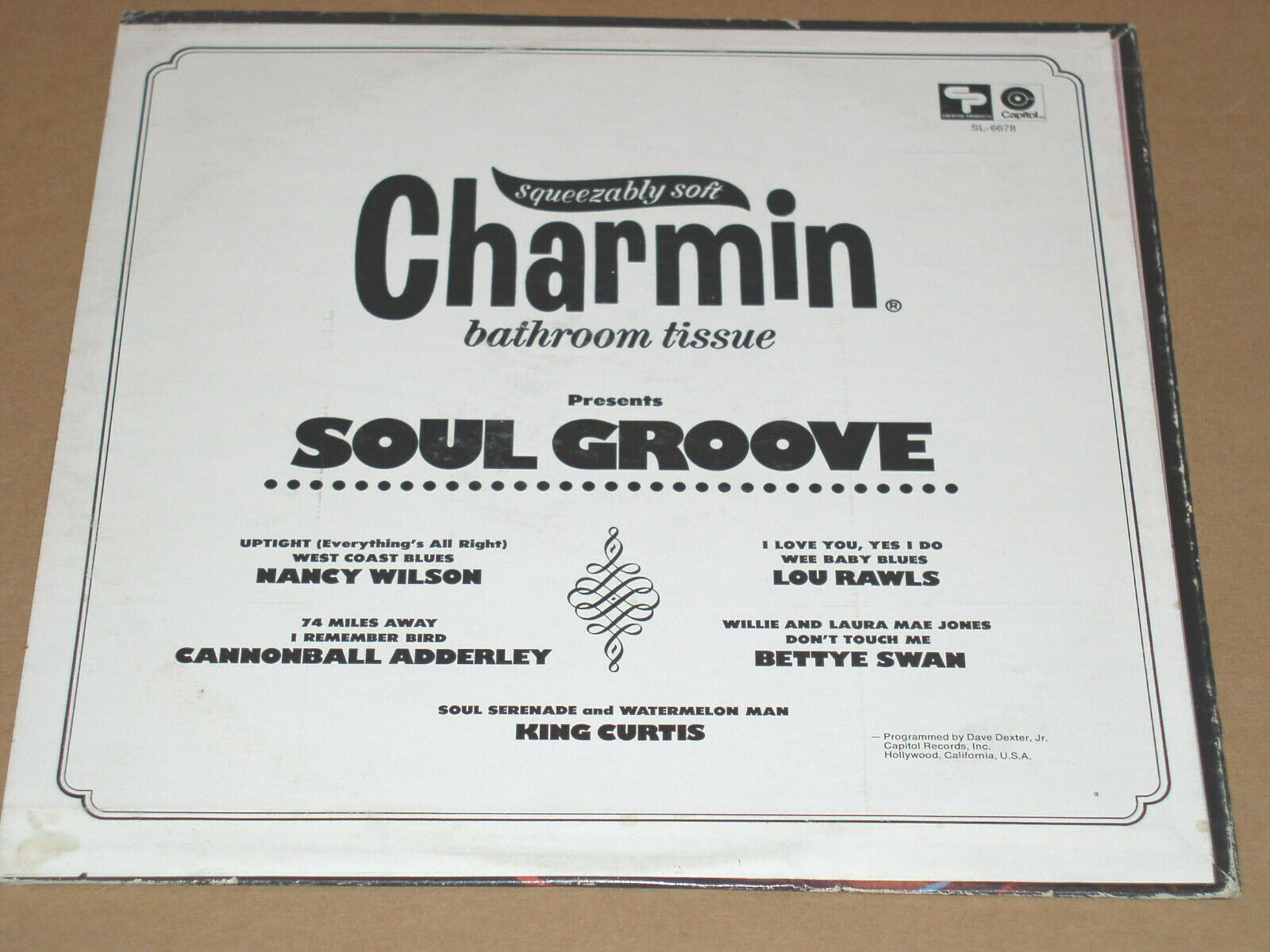 This is a vintage phonograph record entitled, "Charmin Bathroom Tissue Presntes Soul Groove". Record label: Capitol Creative Products SL-6678.