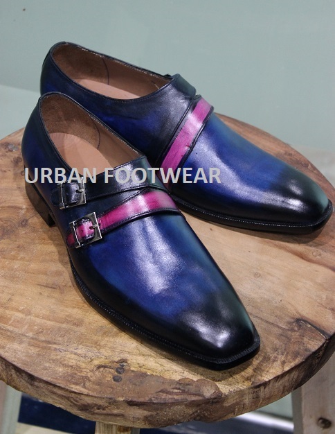 New Men's Handmade Formal Two Tone Pink & Blue Leather Double Monk Dress