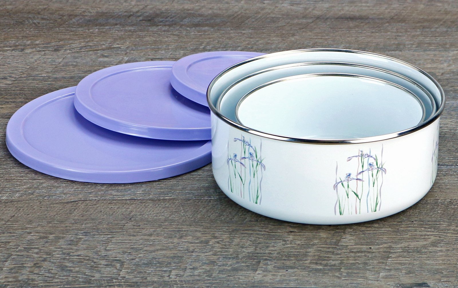 Enamel on steel bowls with Plastic (BPA free) airtight lids