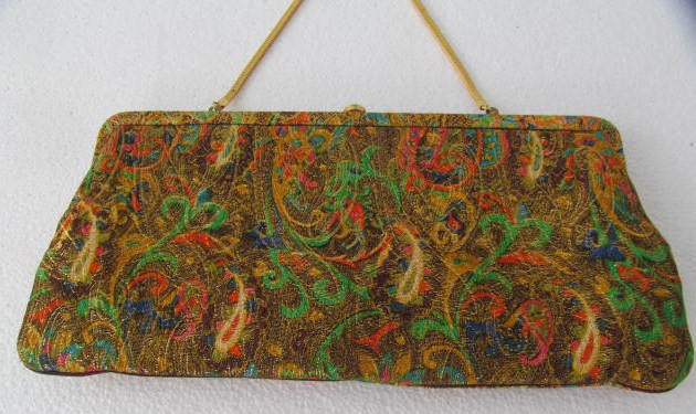 This is a really unique one-of-a-kind colorful designer made ladies clutch bag, which is in excellent condition considering the age, the fabric is multi colored metallic gold brocade material and a silk finish on the inside.