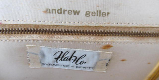 On the inside is a tag that reads Flahlo Syracuse, Dewitt and stamped in gold lettering is "Andrew Geller"