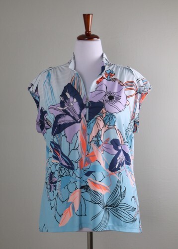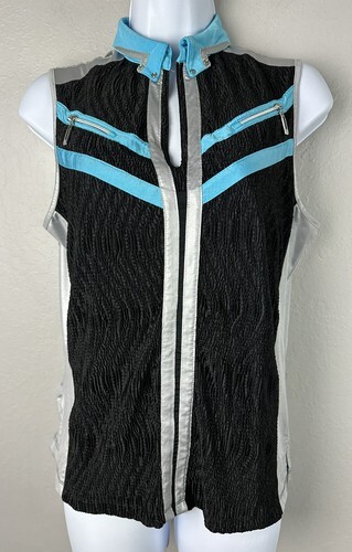 It has a zip placket. The lightweight stretch fabric is 94% Polyester 6% Spandex. The color is Bright Blue called BAYOU BLUE with a bit of Black Yellow trim.