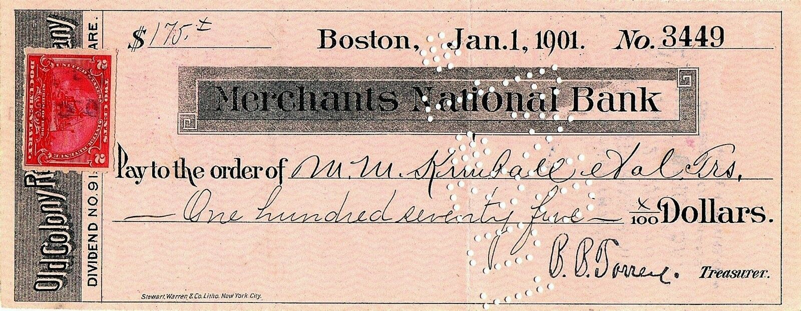 January 1, 1901 Merchants National Bank, Old Colony Railroad, Dividend Check