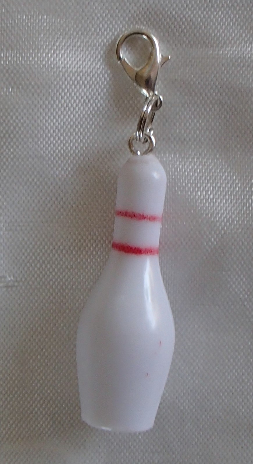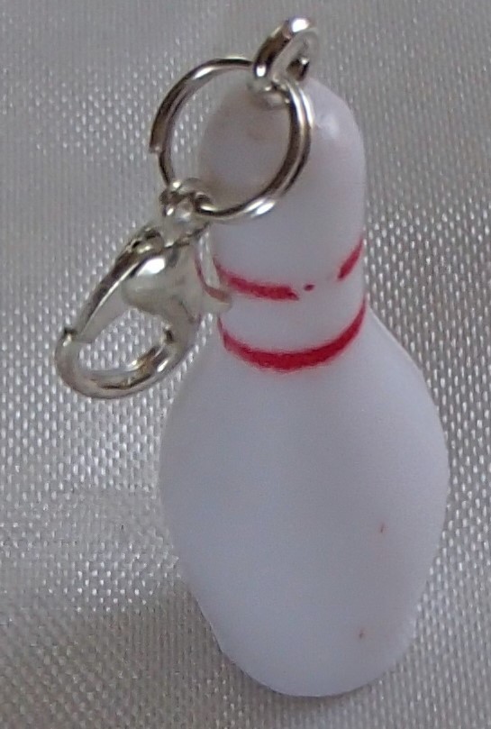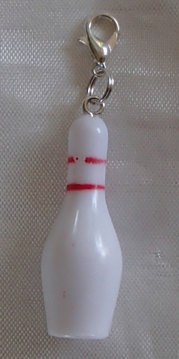 I handcrafted this cute little bowling pin zipper clipper used from a brand new in package dollhouse size miniature bowling game. I formed the hole and added the steel screw eye hook. The pin is made of solid resin (not hollow). I also used a split double jump ring so the pin is securely attached and will not come apart and fall off.
