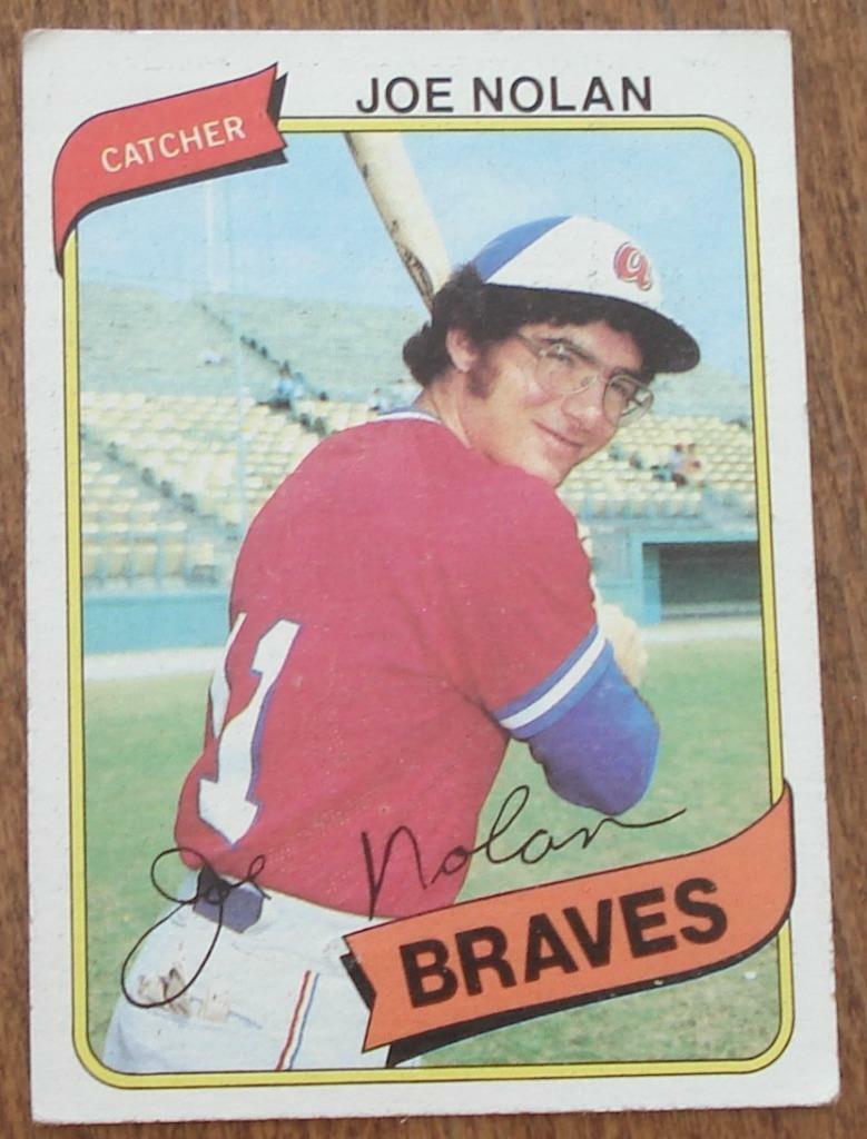 Today for consideration is this Joe Nolan Card. It has a date of 1980, when he played with the Atlanta Braves. It is card number 64. It is in very good condition, with some of wear at the corners and edges. It is a Topps baseball card.