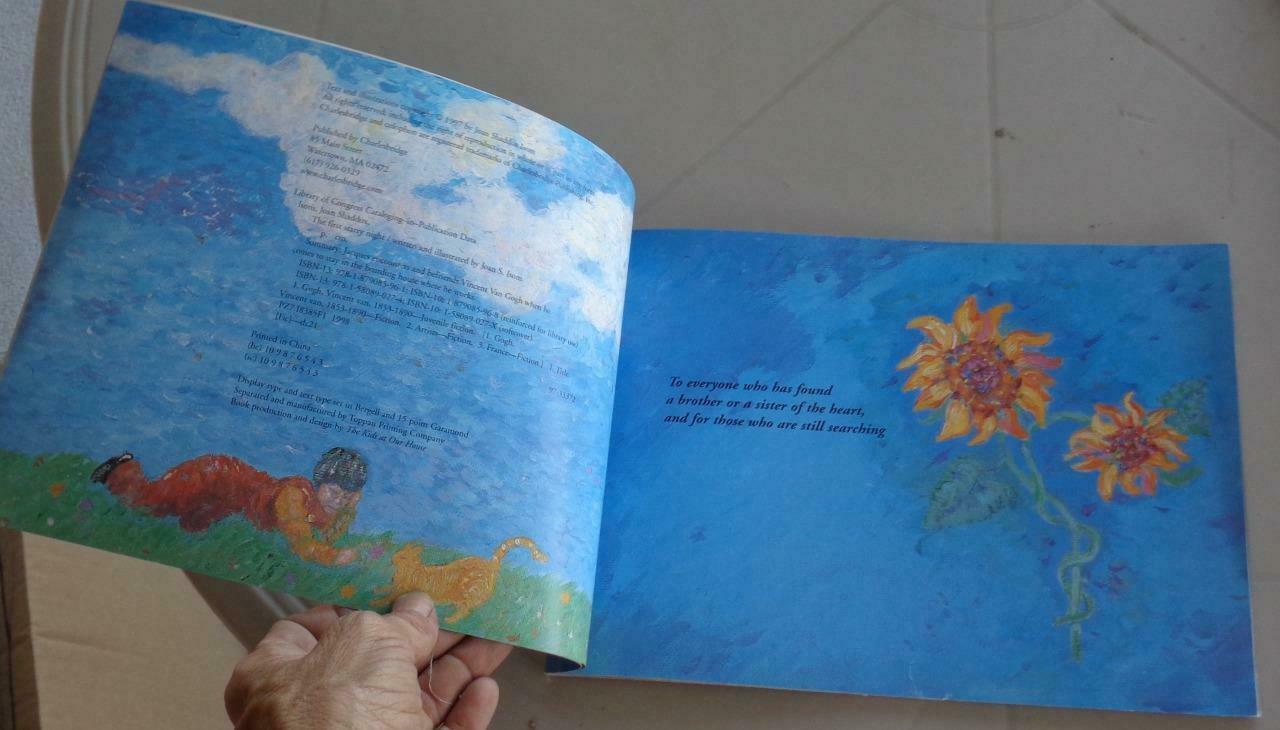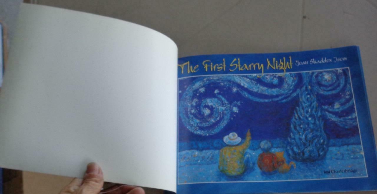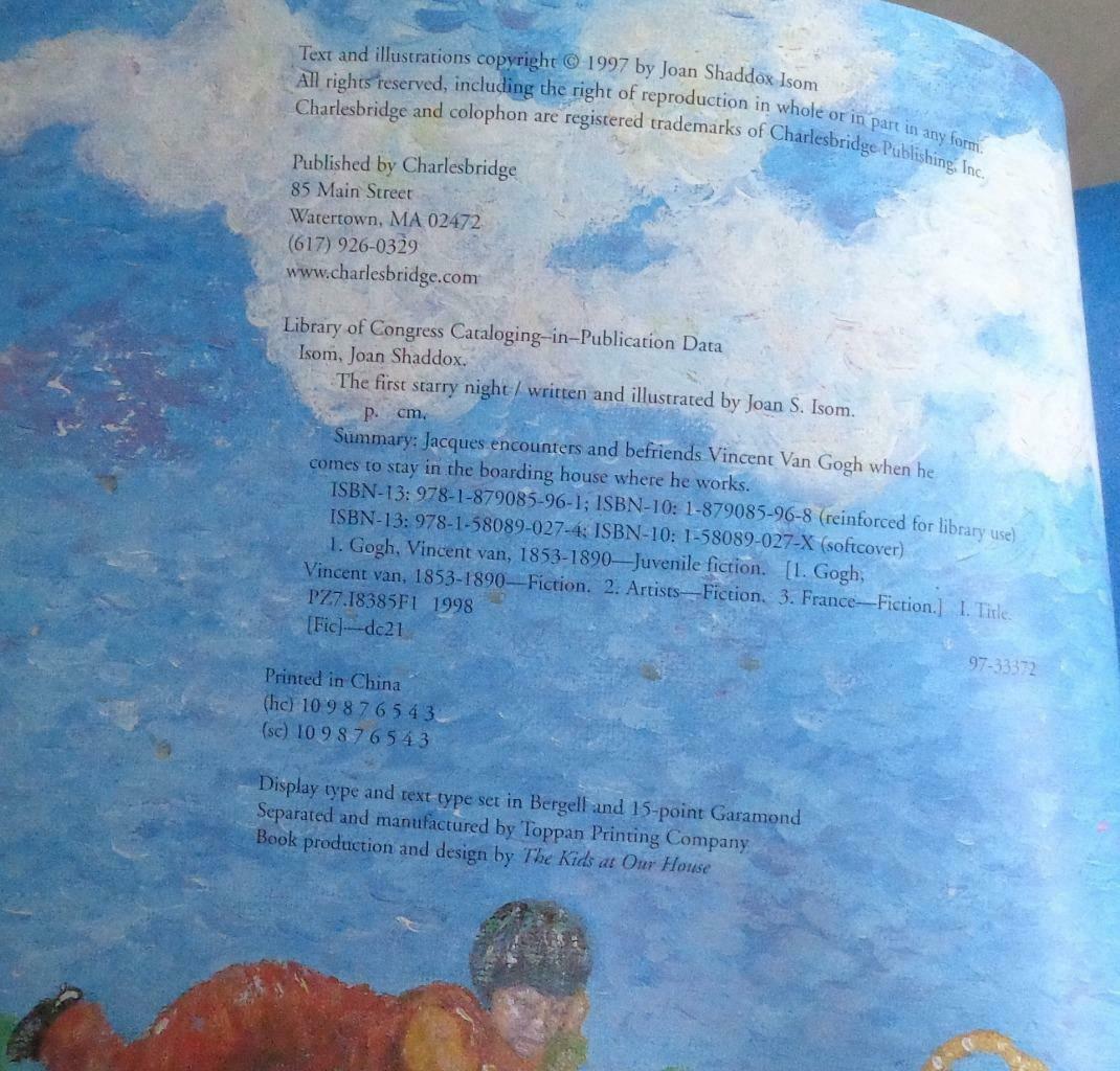 Offered here is this Great Soft Cover Edition of The First Starry Night, by Joan Shaddox Isom. It is in very good condition. The cover has some light stains on it, as well as some light wear at the corners and edges. The spine and binding are good, and all pages are intact and in good condition. This book is a fictional account of Vincent van Gogh's short stay in Arles France. It is warmly seen through the eyes of a young boy named Jacques. This is a very nice story book for children, with a colorfully illustrated pages that are reminiscent of van Gogh. It has a copyright date of 1997, and was published by Charlesbridge.