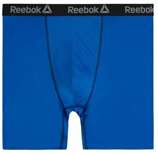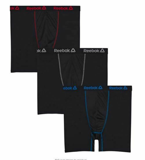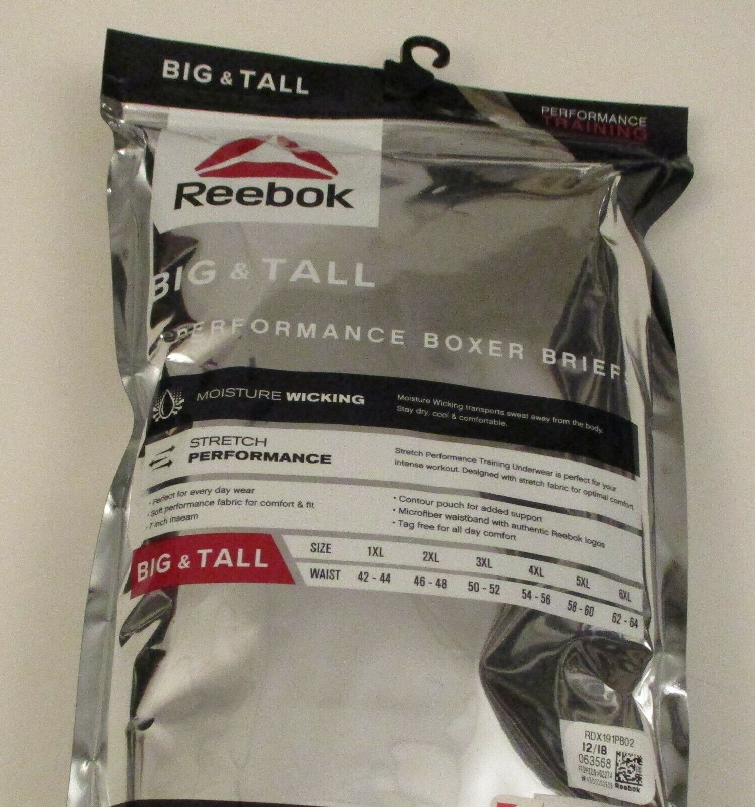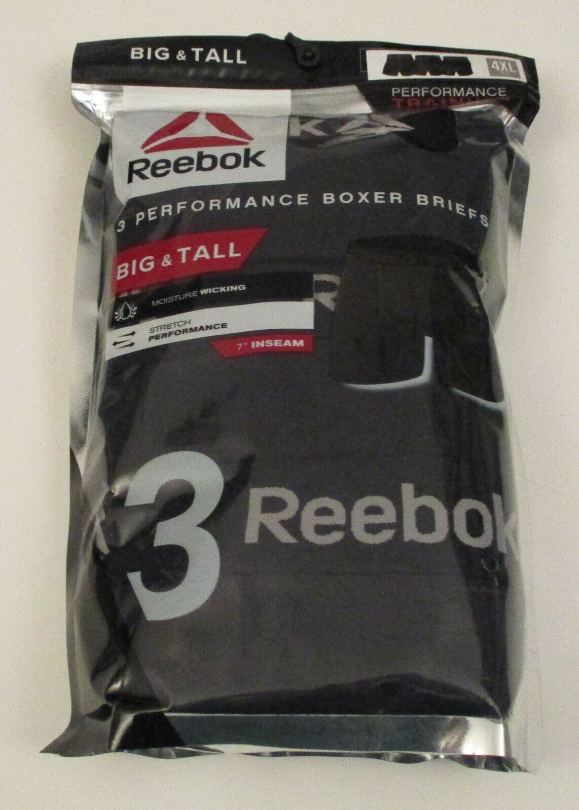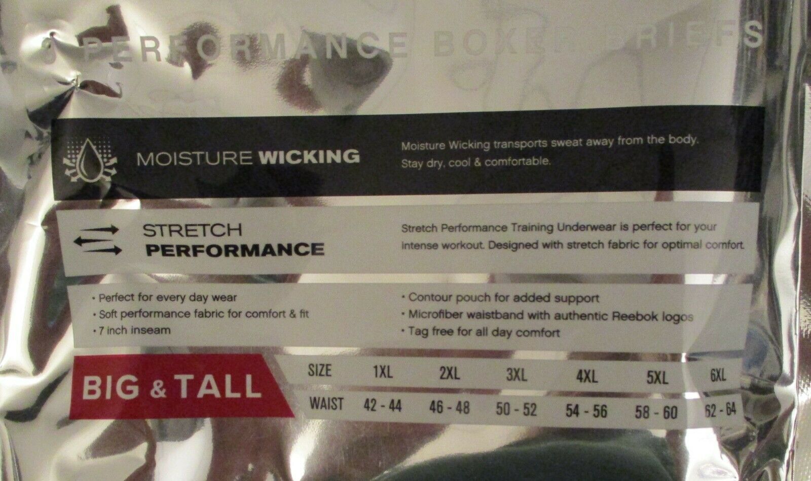 New 3-Pack of Reebok Performance Traning Men's Boxer Briefs This listing is for 1 pack of 3 boxer briefs. Choice of Colors: 3 Black 2 Black / 1 Gray 2 Black / 1 Blue 2 Black / 1 Red 3 Black with colorful waistband and stitching 3 Blues Moisture wicking transports sweat from the body. 92% Polyester / 8% Spandex (Blues are 90% Polyester / 10% Spandex) Microfiber Signature waistband. 7 inch inseam. Contour Pouch for added support. Machine Washable. Imported. Available Sizes Waist Size 2XL 3XL 4XL Inches 46-48 50-52 54-56 58-60 117-122 127-132 137-142 147-152 International shipments will be marked for customs as merchandise. These charges are the buyer's responsibility. Please check with your country's customs office to determine what these additional costs will be prior to bidding or buying