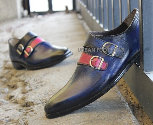 New Men's Handmade Two Tone Blue Leather Double Strap Buckle Dress & Casual