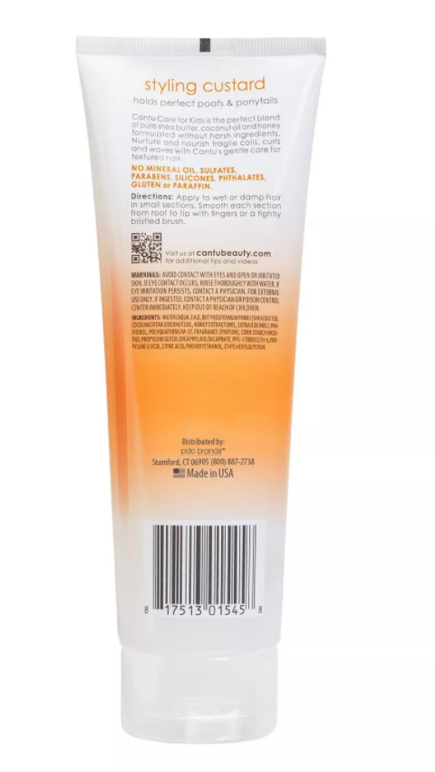 Looking for the perfect product to increase hold and reduce frizz for your curly kid? Cantu's award-winning Care For Kids Styling Custard will eliminate the need for constant retouching and restyling, but is also formulated with your child in mind. Reap all the benefits of this amazing such as fuss-free styling, intense hydration, and style longevity. Your curly kid will thank you! Cantu's Care For Kids Styling Custard infuses 100% pure shea butter, coconut oil, and honey to gently nourish fragile curls, coils, and waves. To use, apply a generous amount to dry or damp hair in small sections. Smooth each section from root to tip with fingers or a tightly bristled brush, then style as usual. For best results, pair with other Cantu products like the Care For Kids Conditioning Detangler.