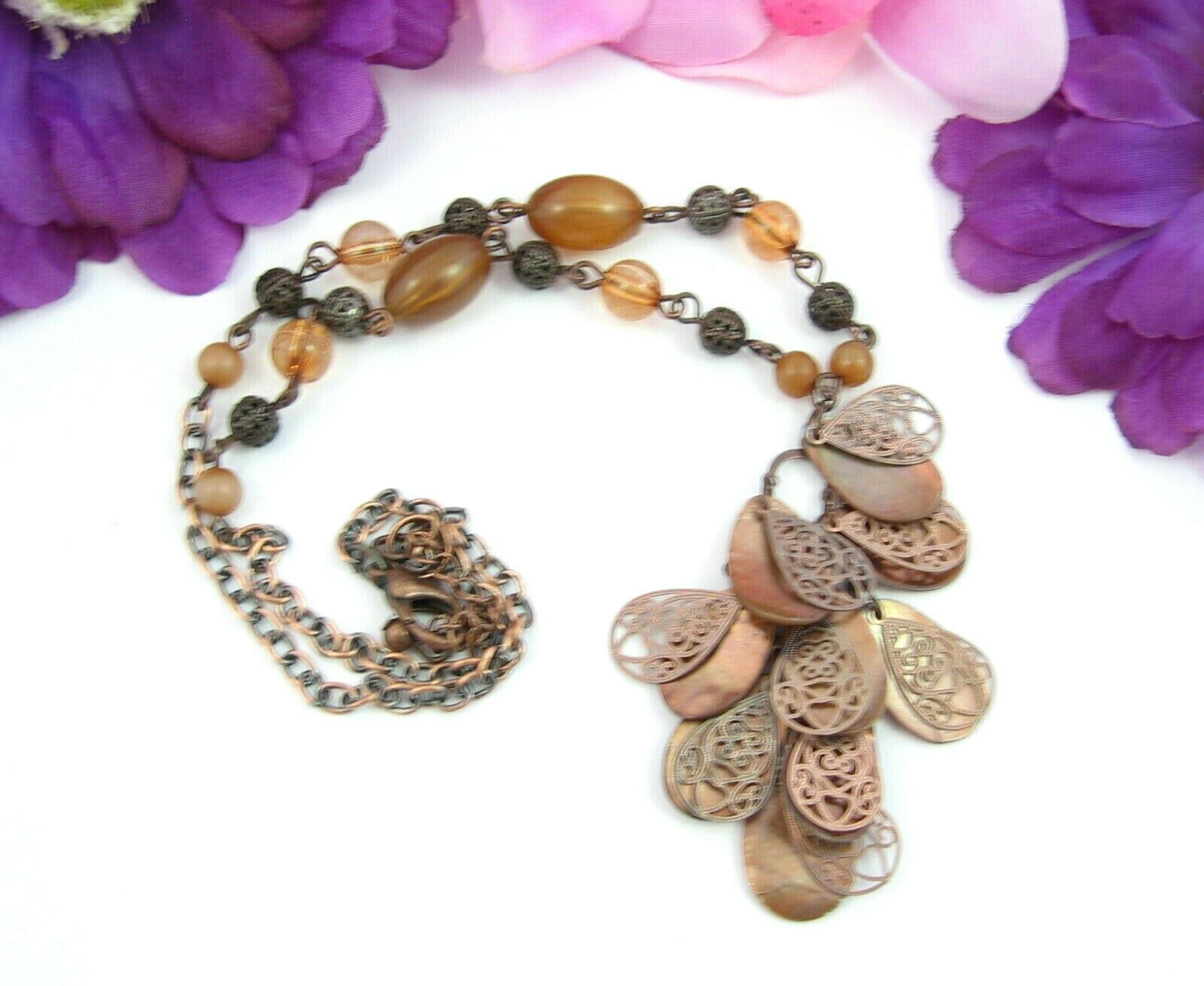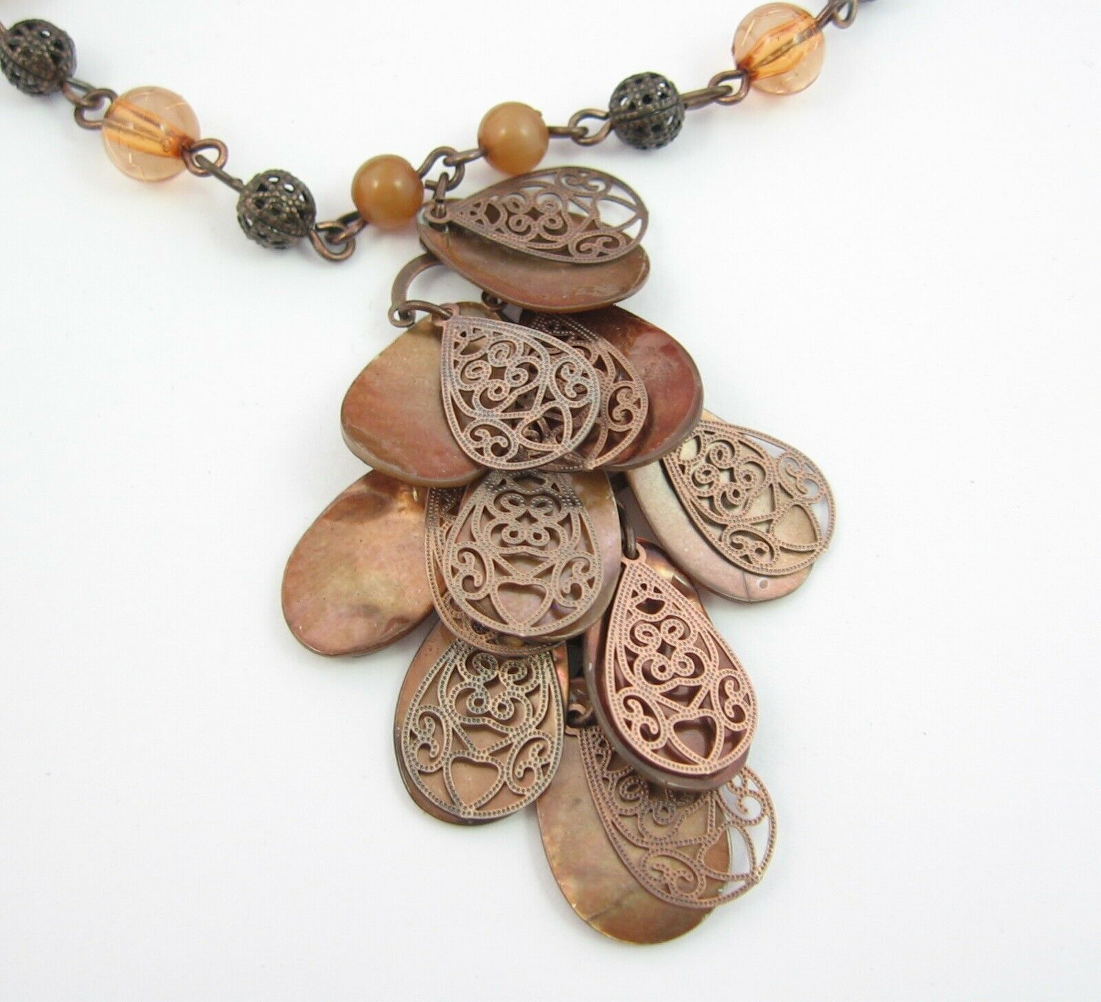 Copper & Seashell TEARDROPS Double Dangle Pendant Necklace Vintage Beads 20"
