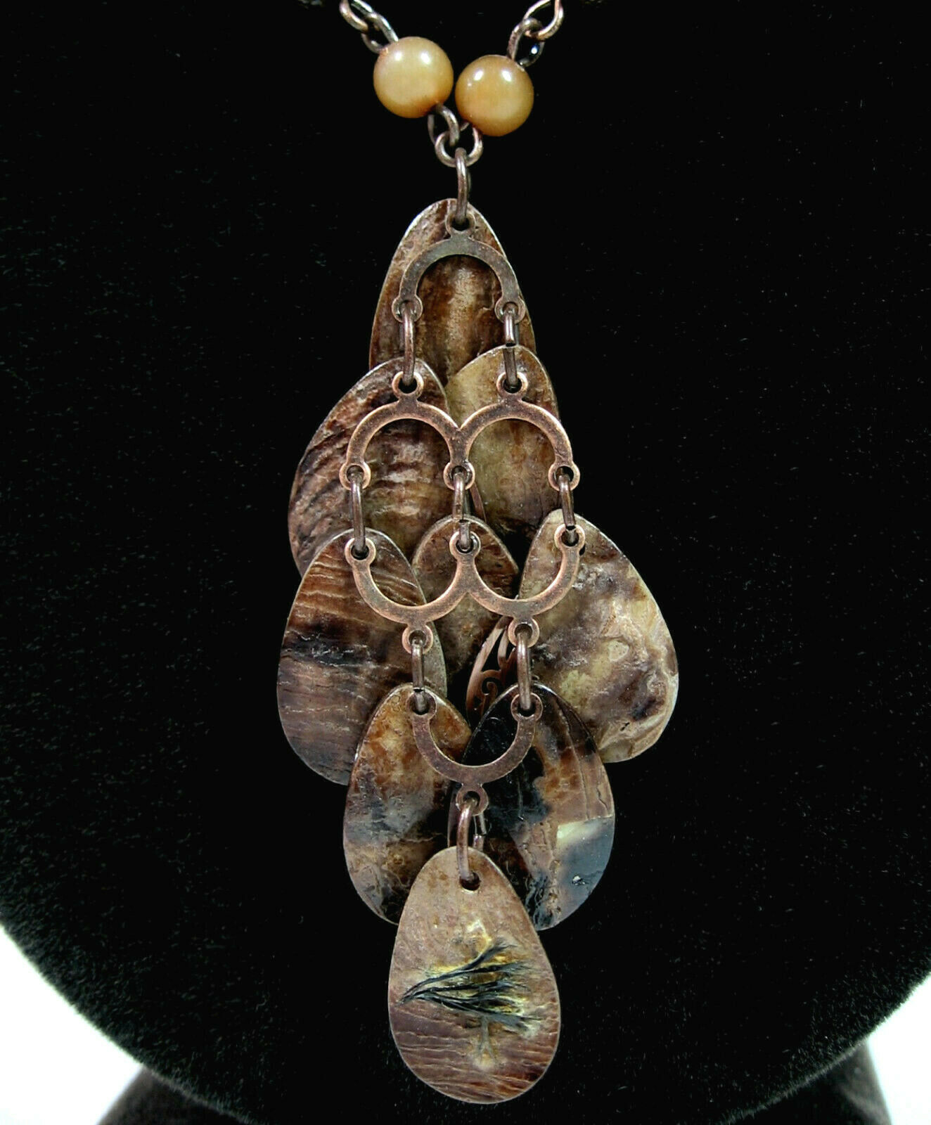 This is a vintage COPPER and SEASHELL TEARDROP PENDANT Autumn Color Beaded NECKLACE!