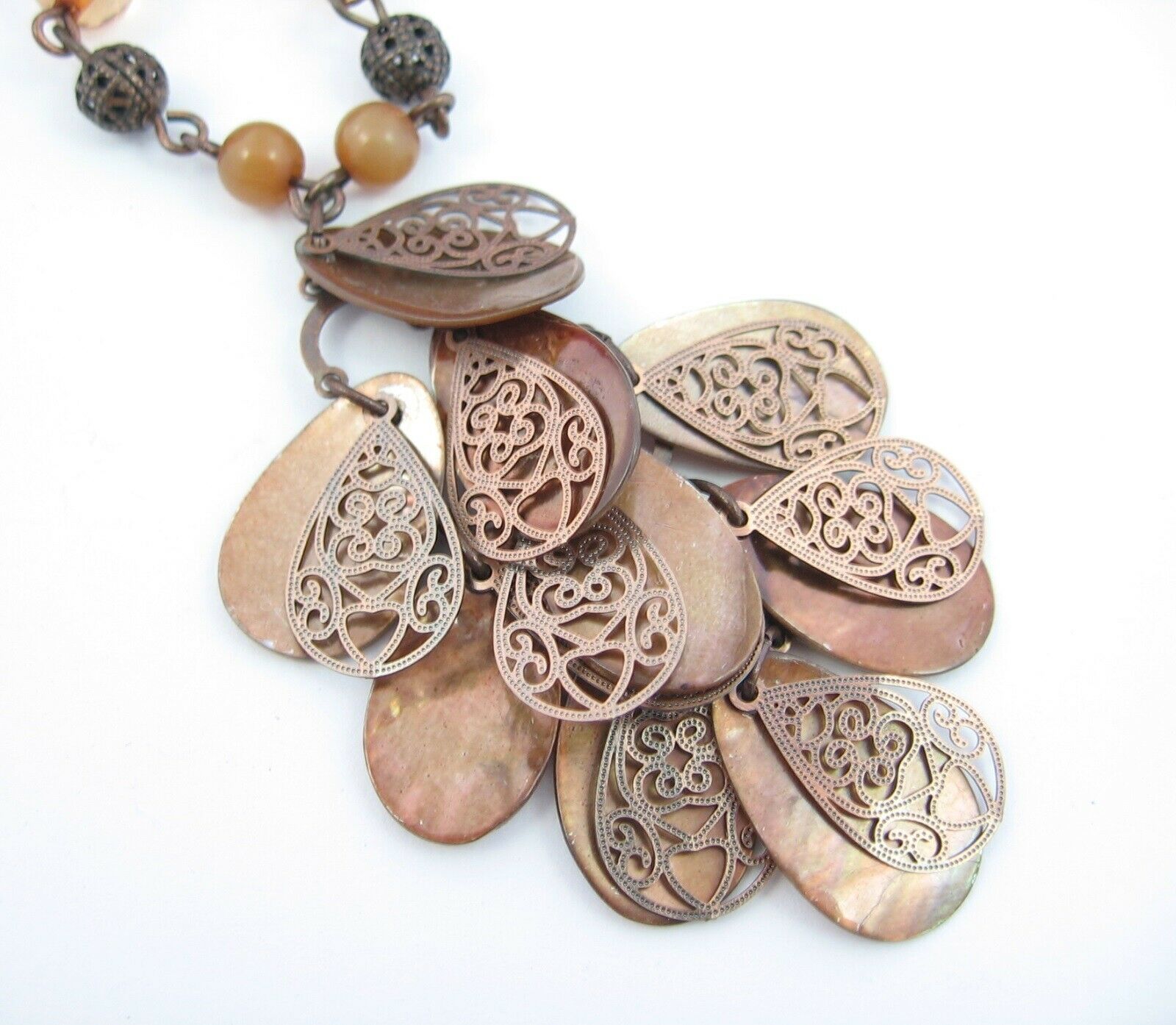 There are TWO types of the Teardrop Charms. First there are copper ones with an open work design. And in front or behind them (depending upon how you want to wear it) are teardrops cuts from an abalone or mother of pearl shell that have been colored or dyed to match the overall copper-brown color!