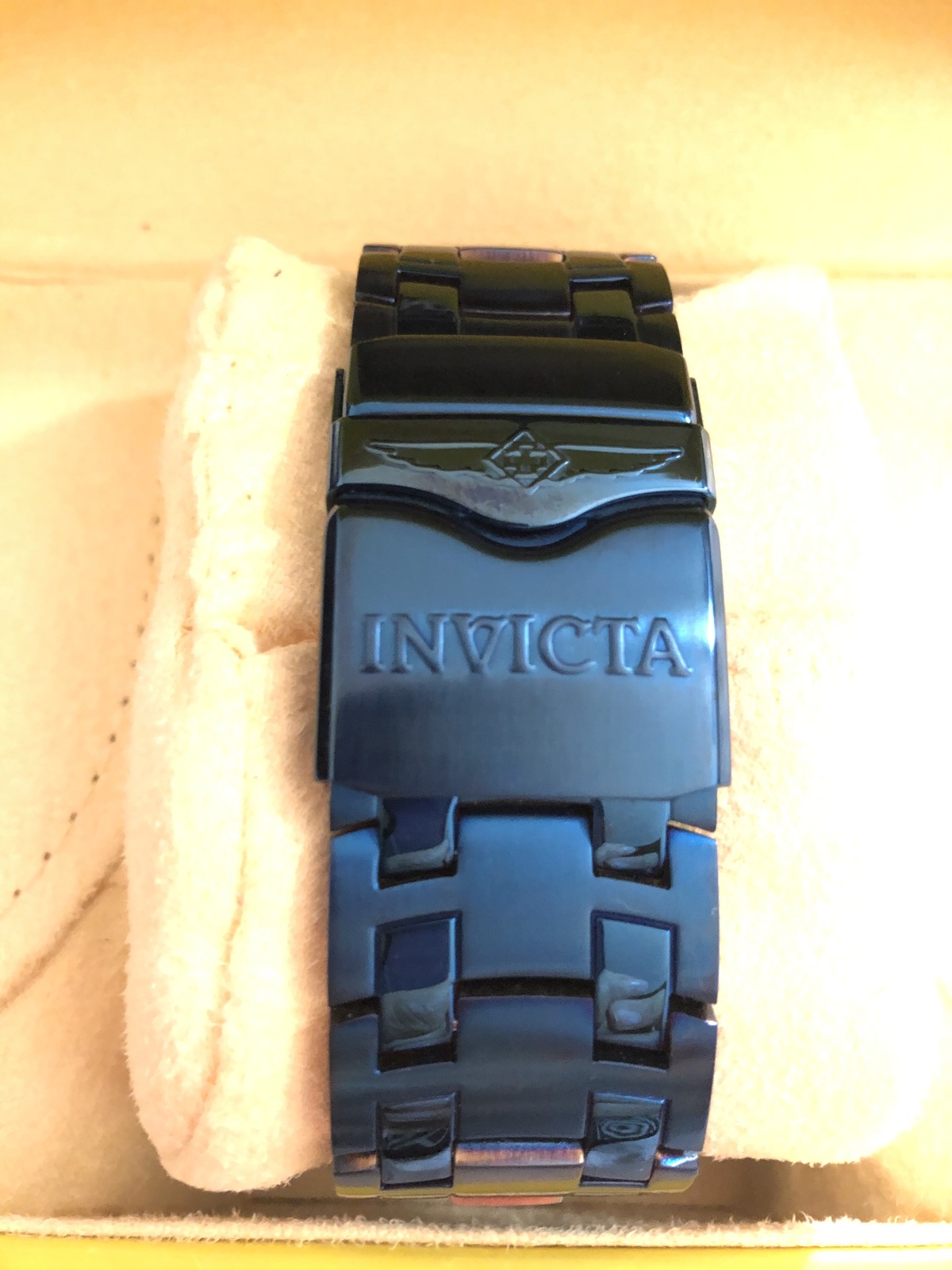 Blue ion-plated stainless steel case and bracelet. Uni-directional rotating rose gold-plated bezel with blue top ring. Champagne dial with skeleton hands and dot hour markers. Minute markers around the outer rim. Dial Type: Analog. Luminescent hands and markers. Three multi-function sub-dials displaying: 24 hour, date and day of the week. Quartz movement. Scratch resistant flame fusion crystal. Pull / push crown. Solid case back. Case diameter: 48 mm. Case thickness: 17 mm. Round case shape. Band width: 26 mm. Band length: 8.25 inches. Fold over clasp with safety release. Water resistant at 50 meters / 165 feet. Functions: date, day, hour, minute, second, 24 hour. Casual watch style. Invicta Pro Diver Multi-Function Champagne Dial Blue Ion-plated Men's Watch 15044.