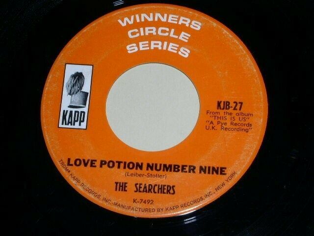 This is the original vintage 45 rpm release of the Searchers' song, "Love Potion Number Nine". Flipside: "Hi-Heel Sneakers". Record label Kapp KJB-27 (Winners Circle Series).
