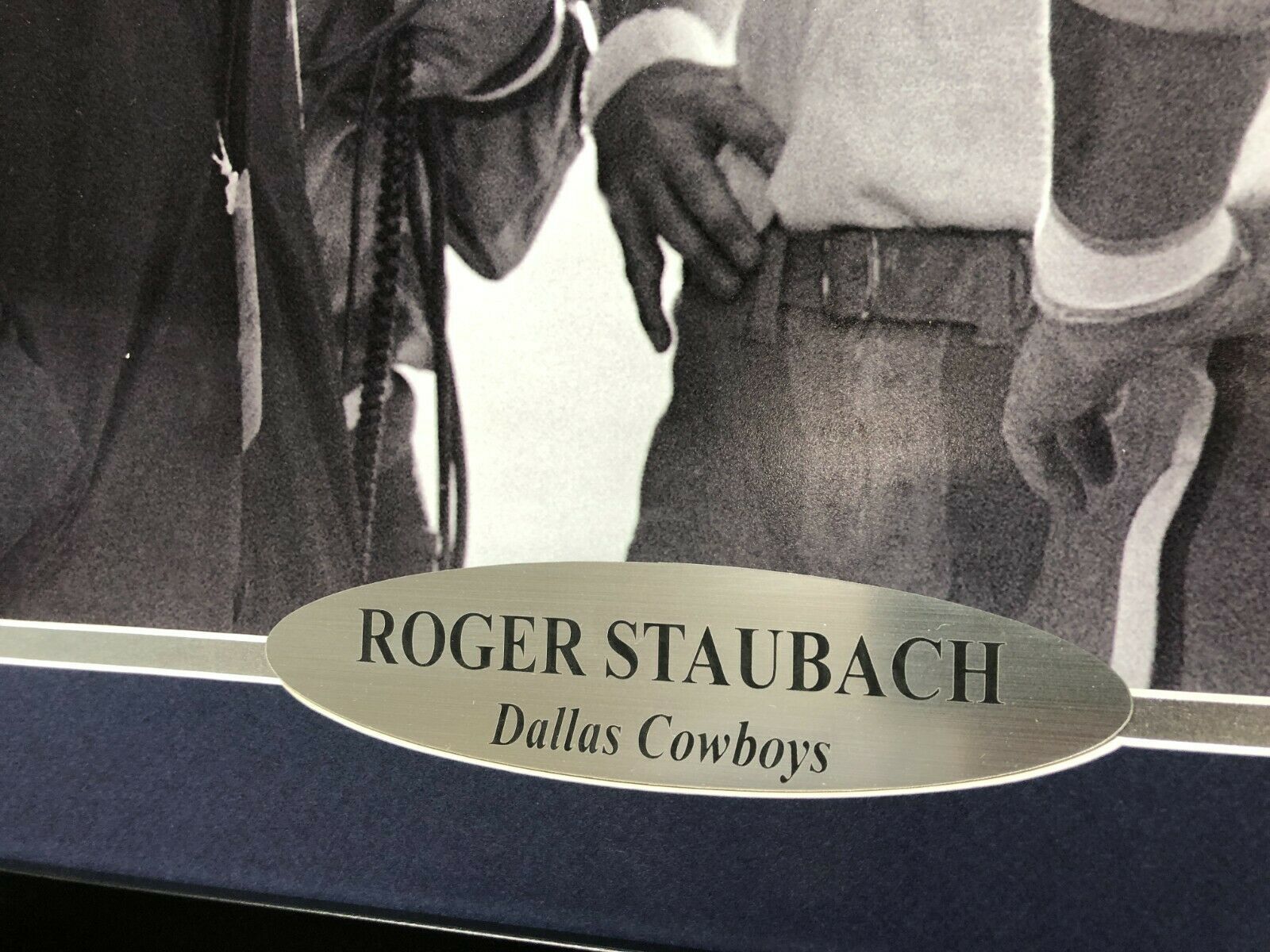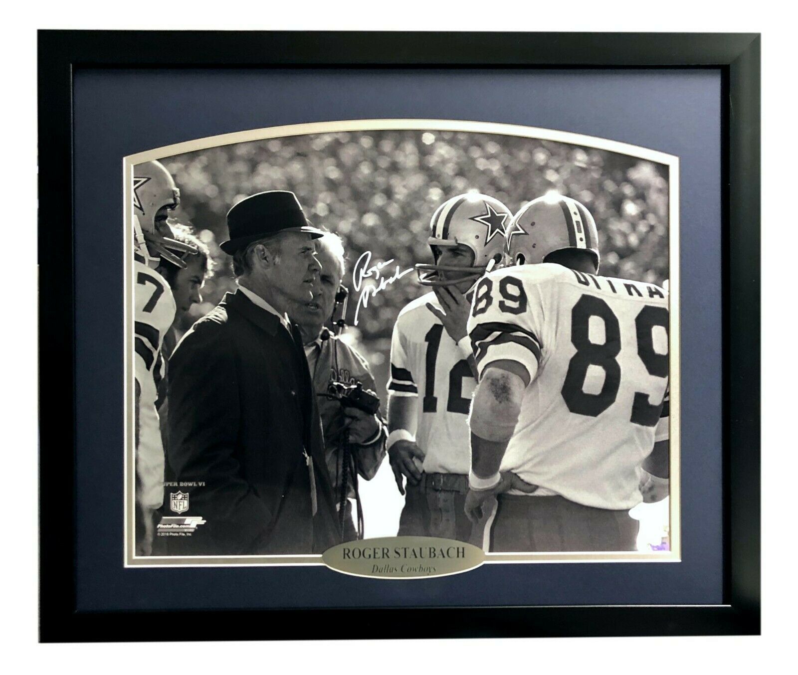 Dallas Cowboys fans, this is your calling. Check out this hand signed Roger Staubach 16x20 photo w/ Tom Landry pictured!! This is a great shot of the head coach and legendary QB from Super Bowl 6 in which also pictured is also Cowboys tight end Mike Ditka way before he was the head coach of the 1986 Chicago Bears! This is a must-have item for all Staubach and Cowboy fans' man caves, game rooms, offices and lady lairs! This item has been certified authentic by one of the most reputable and recognized authenticators in the business today, James Spence Authentication (JSA). This item comes with a JSA numbered tamperproof authentication sticker that can be reviewed on their website 24/7/365. This item has been professionally custom framed in a black frame with double team color matting, measuring approx. 28" x 24 in size with a glass display and a silver laser engraved nameplate depicting information about the legend! This is a stock item, autographs may vary as well as the location of the autograph.
