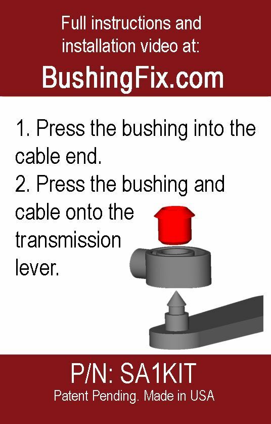 This is a complete kit engineered to provide a safe and effective means to replace the transmission bushing. The patented (US Patent # 10,215,273) kit includes our custom molded bushing designed specifically for the Saturn cable.