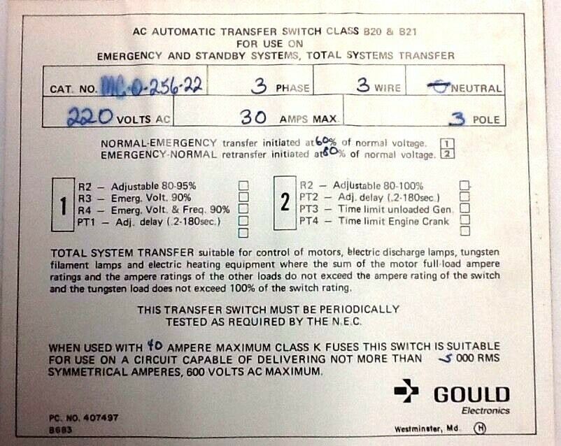 onan 307-2255 Gould Cat. No. MC-0-256-22 AC Automatic Transfer Switch Class B20 B21 for use on emergency and standby systems, total systems transfer.