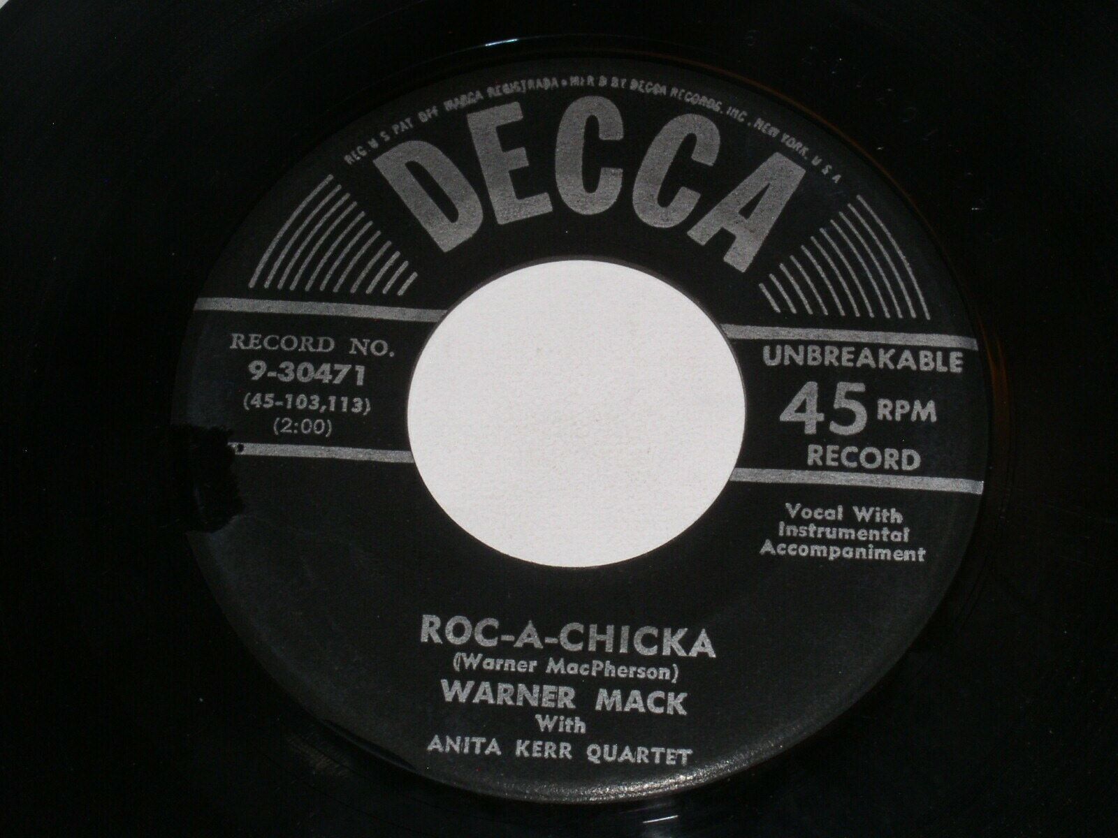 This is an original, vintage 45 rpm phonograph record by Warner Mack entitled, "Roc-A-Chicka". Flipside: "Since I Lost You". Record label Decca 9-30471.