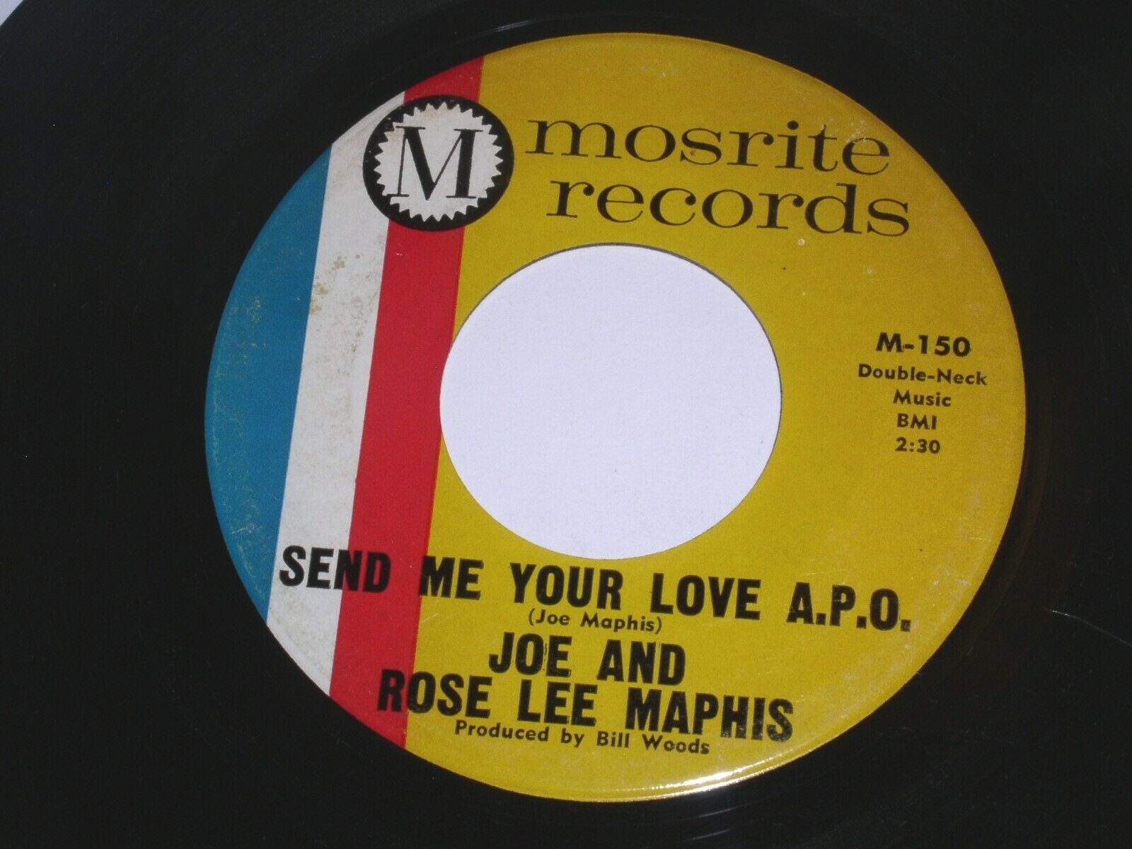 This is an original, vintage 45 rpm phonograph record by Joe And Rose Lee Maphis entitled, "Send Me your Love A.P.O.". Flipside: "Write Him A Letter". Record label Mosrite M-150 M-160.